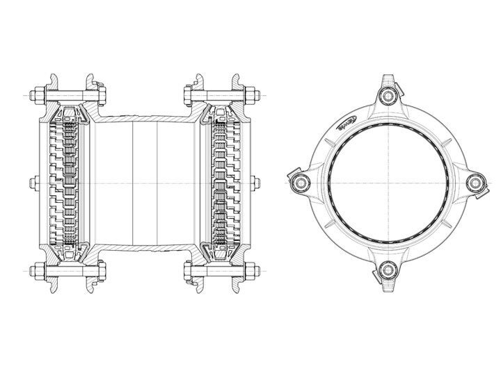 Synoflex kobling, en fleksibel og pålidelig løsning til alle typer rørmaterialer. Nem at installere, holdbar og korrosionsbestandig. Ideel til både over- og underjordiske applikationer.