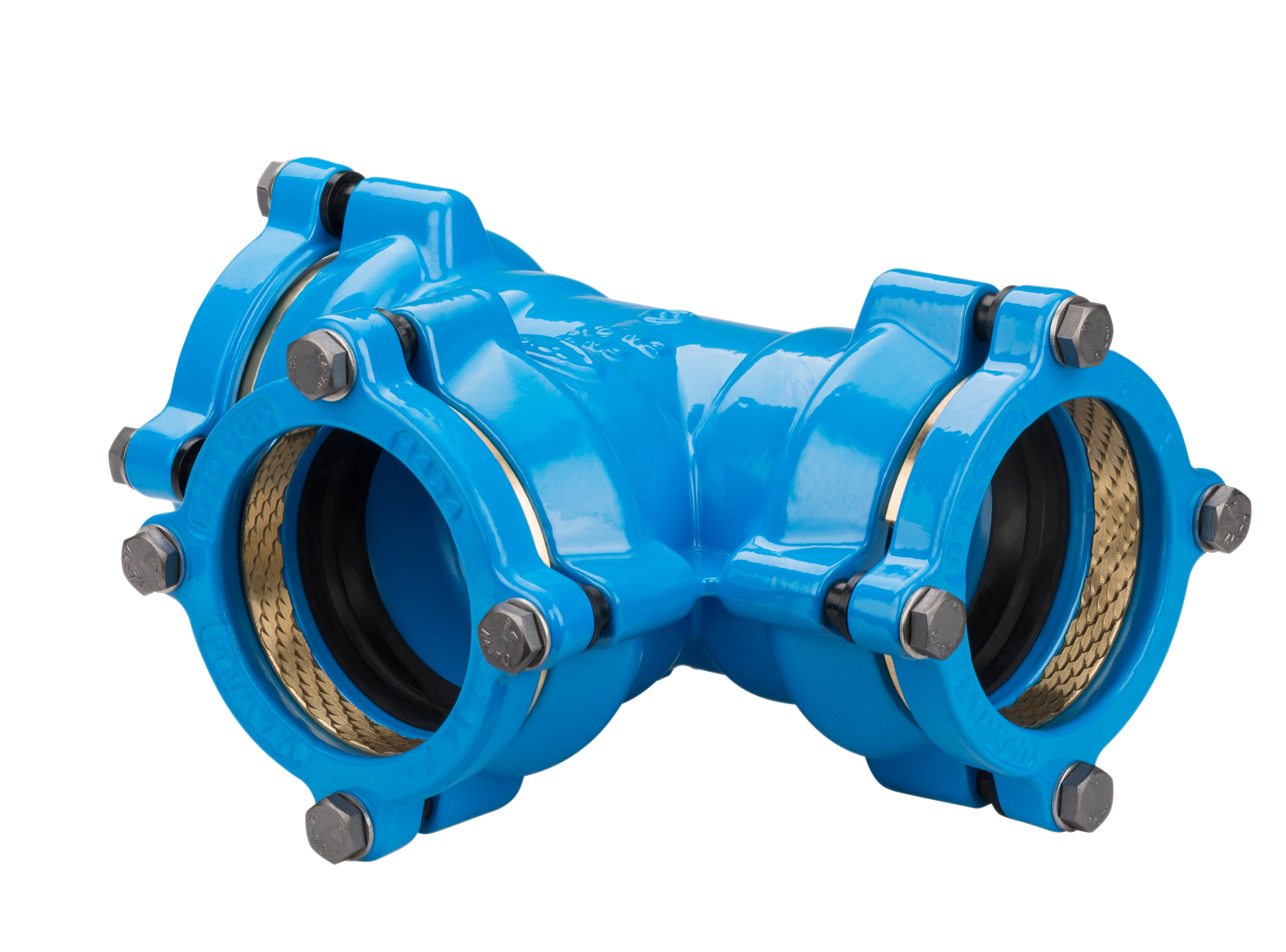 Hawle 8515 er et fuldmuffet T-rør i System 2000, designet til at skabe træksikre og tætte rørforgreninger i tryksatte vandledninger. Alle tre tilslutninger er udstyret med Synoflex-muffer, som muliggør tilslutning til rør af forskellige materialer såsom duktilt støbejern, PVC, PE og stål – uden behov for ekstra overgange. Konstruktionen består af segjern (EN-GJS) med pulverepoxybelægning i henhold til GSK-standarden, hvilket giver langvarig beskyttelse mod korrosion og mekanisk påvirkning. Tætningssystemet bygger på gennemprøvede læbetætninger i elastomer, som sikrer en pålidelig forbindelse selv ved varierende tryk og temperatur. System 2000 tillader fleksibel montering, herunder vinkelafvigelser på op til ±8° samt aksial bevægelse, hvilket letter installationen selv i trange rum. Alle koblinger er genanvendelige, demonterbare og kræver ikke specialværktøj. Hawle 8515 er særdeles velegnet til både nyinstallationer og renovering af eksisterende net, især hvor der stilles krav til holdbarhed, hurtig montering og høj tæthed. Fås i nominelle dimensioner fra DN 80 til DN 300, trykklasse PN 10/16.