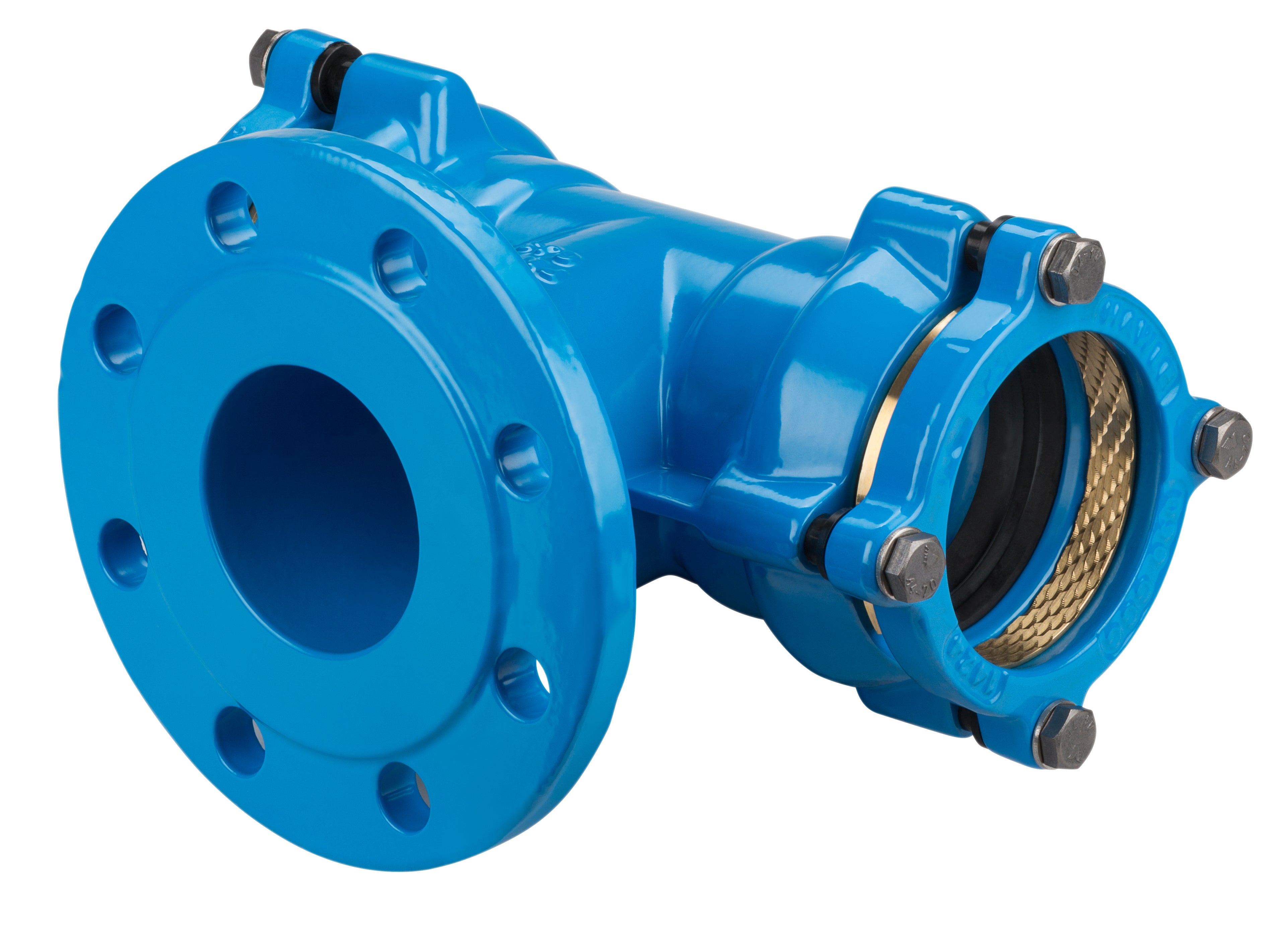 T-rør med to muffeforbindelser og flange i System 2000. Fleksibel og trækfast forbindelse til forskellige rørmaterialer.