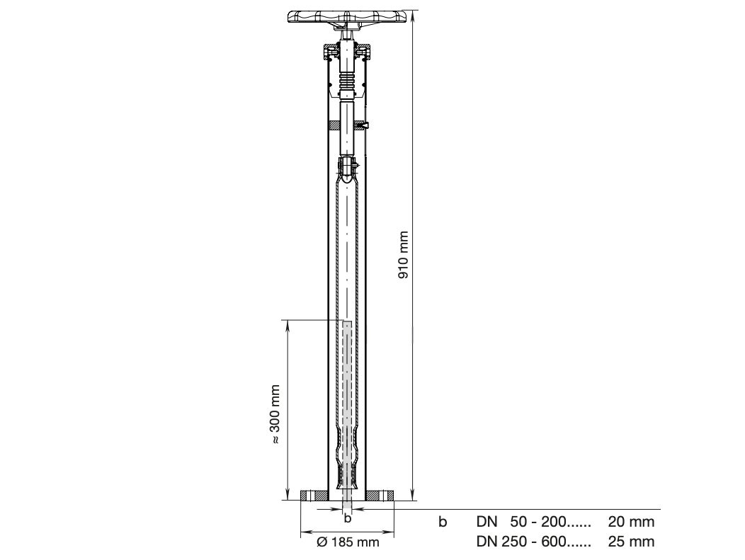 Stativet installeras med en standardhöjd på cirka 910 mm och en fotdiameter på cirka 185 mm. Tjockleken på anslutningsplåten varierar beroende på ventilens dimension: 20 mm för DN 50–200 och 25 mm för DN 250–600.