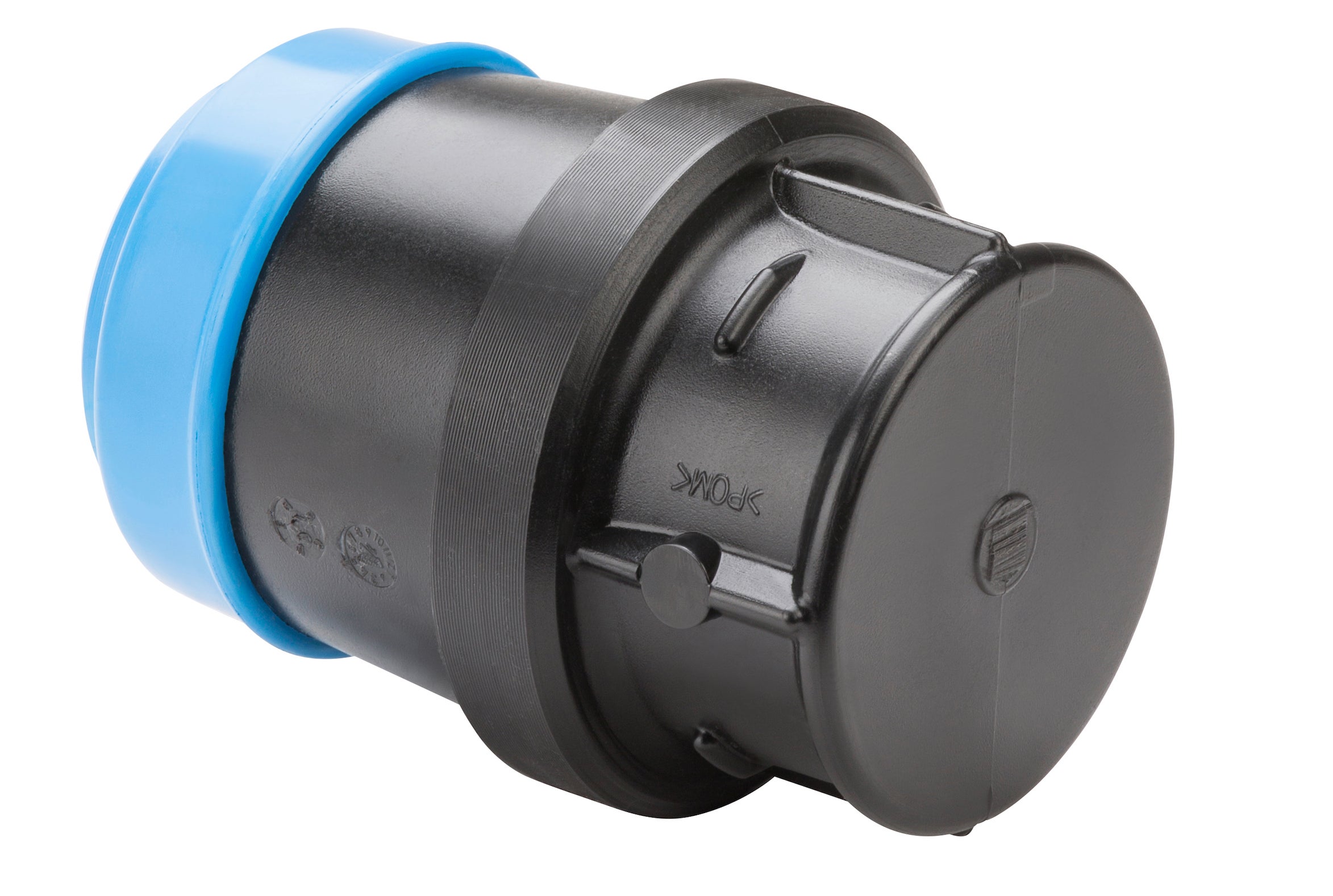 Kopplingshuset är tillverkat i UV-stabiliserad POM-kopolymer med invändiga gängor förstärkta med rostfri stålringsinsats. Kopplingen är flexibel, kan roteras på röret samt demonteras utan att påverka tätning eller grepp. Färgade skyddslock anger avsett medium och skyddar mot nedsmutsning.