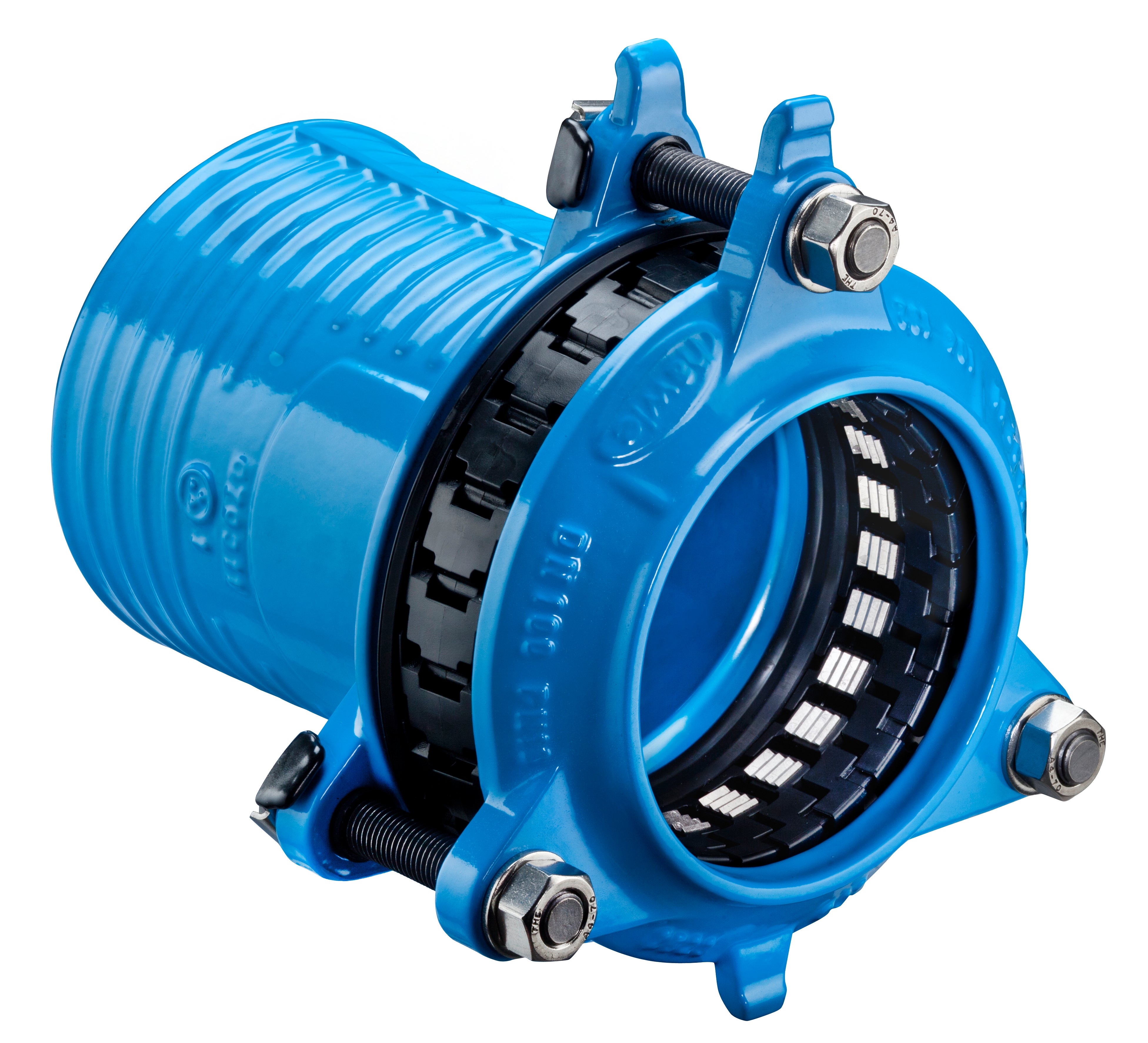 Tätningen sker med flexibel EPDM-packning enligt EN 681-1, godkänd för dricksvatten. Den flexibla Synoflex-ringen i POM säkerställer jämn tryckfördelning runt röret, medan låskilar i korrosionsbeständigt material ger effektiv draghållfasthet. Varje stödelement är försett med låsbleck för säker fixering. Bultar och muttrar är tillverkade i rostfritt stål A4 enligt EN ISO 3506-1 och -2 och är belagda för att förhindra skärning. Bulthuvuden är försedda med låsanordning i rostfritt stål med skydd av elastomer, och bultarna är vändbara 180° för förenklat montage.