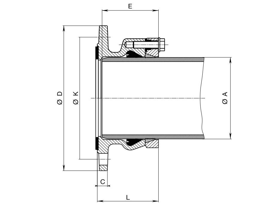 Dragsäker flänskoppling ”System 2000” för PE/PVC-rör upp till PN 16, enligt EN 12842. Läpptätning möjliggör enkel montering, medan det separata dragsäkra systemet aktiveras vid åtdragning av låsringen. Flänsar enligt EN 1092-2. Samtliga material är livsmedelsgodkända och anpassade för dricksvatten.