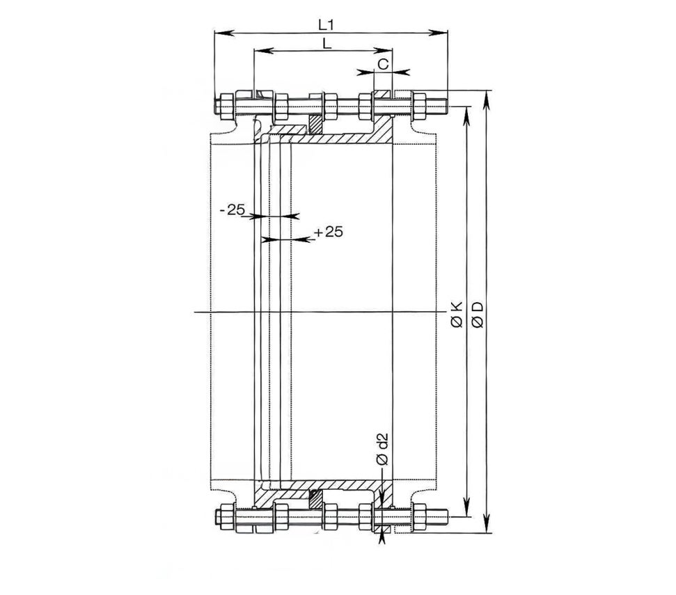 Tillverkad av segjärn EN-GJS-400-15 (flänsändar), centerfläns i stål S235JR, tätning av elastomer, gängstång och muttrar i galvaniserat stål.