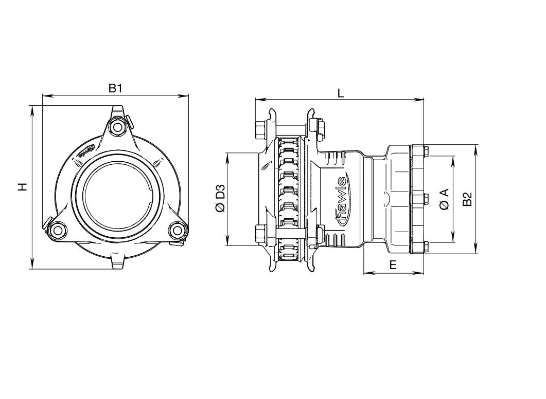 | DN/YD | PN | Artikelnummer | ØA (mm) | Antal bultar | B1 (mm) | B2 (mm) | Bultar gänga | D3 min/max | E (mm) | H (mm) | L (mm) | Vikt (kg) |