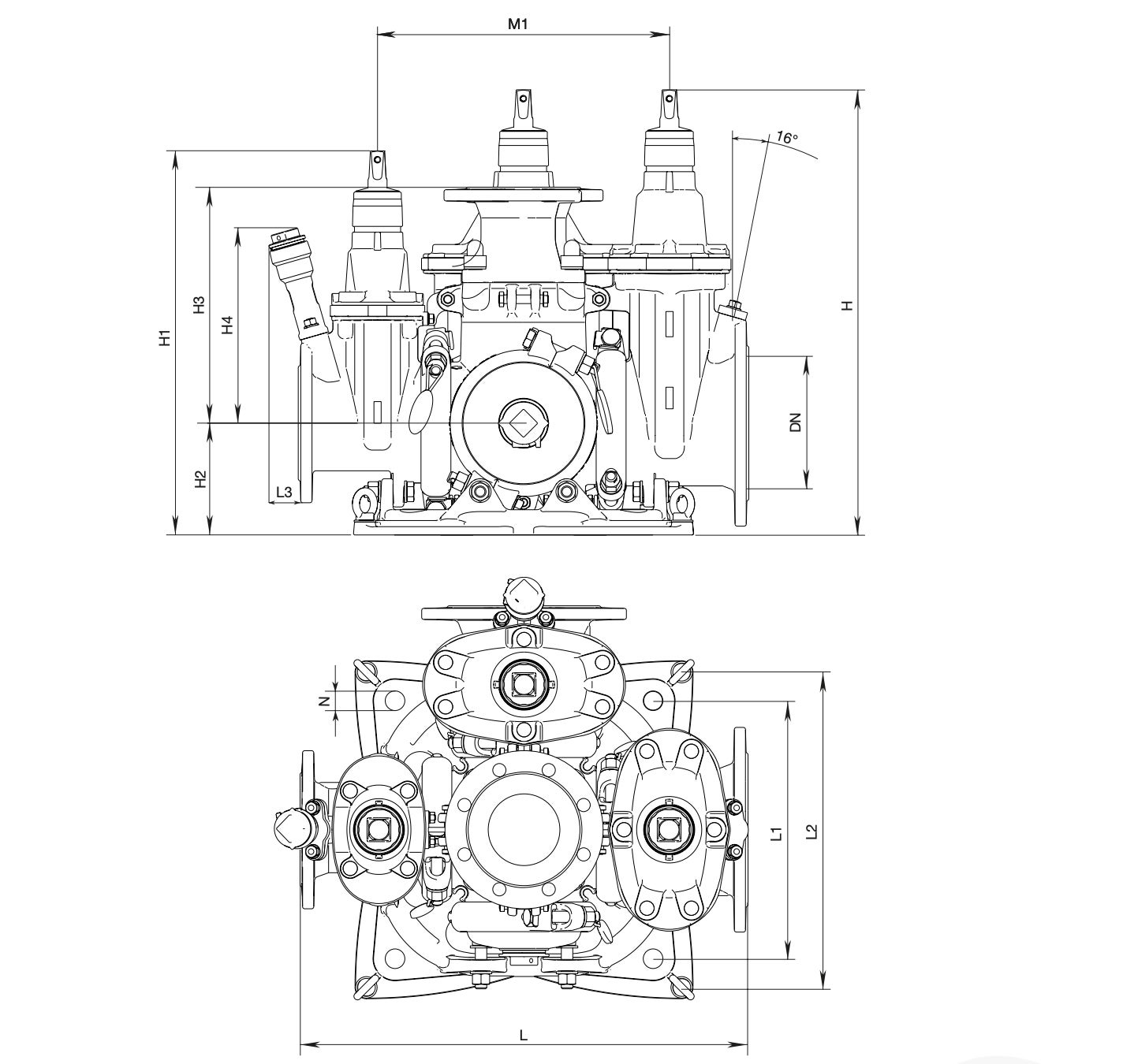 | DN/Antal | Artikelnummer | H (mm) | H1 (mm) | H2 (mm) | H3 (mm) | H4 (mm) | L (mm) | L1 (mm) | L2 (mm) | L3 (mm) | M1 (mm) | N (mm) |