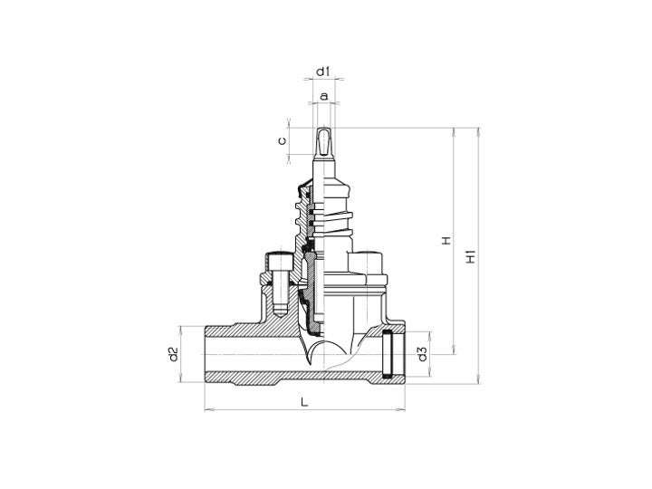 | d3/d2 | PN | Artikelnummer | Spindel a (mm) | Spindel c (mm) | Spindel d1 (mm) | Ventil H (mm) | Ventil H1 (mm) | Ventil L (mm) | Vikt (kg) |