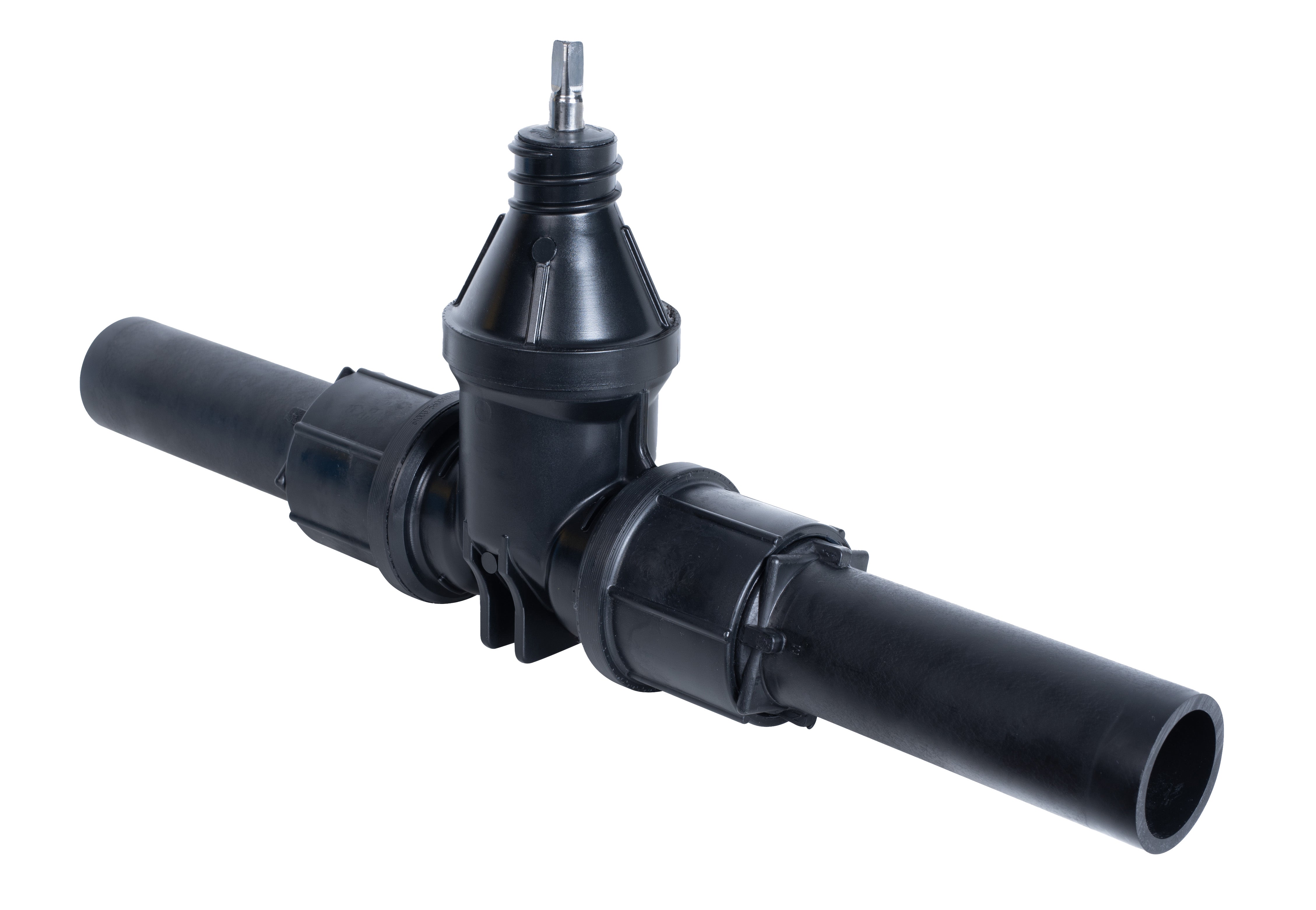 Ventilen finns i dimensioner för PE-rör d32 till d63 och klarar ett maximalt spindelmoment på 80 Nm. Den levereras monteringsklar och kräver inga specialverktyg.
