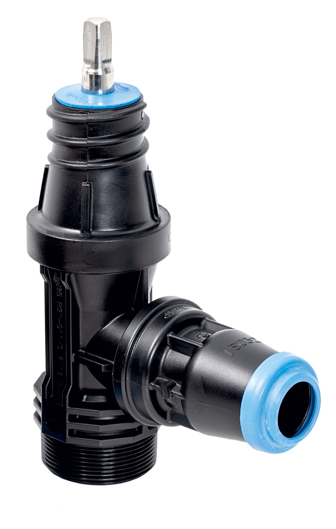 Vinkelventil i POM med 2" utvändig gänga och 1½" anslutningsgänga. För PE-rör Ø25–63 mm via instickskoppling. Slätt genomlopp, PN 16. Friktionsfri tätning mellan kägla och hus. Spindel i duplex rostfritt stål, dubbla O-ringar. Robust, korrosionsbeständig konstruktion – enkel installation utan specialverktyg.