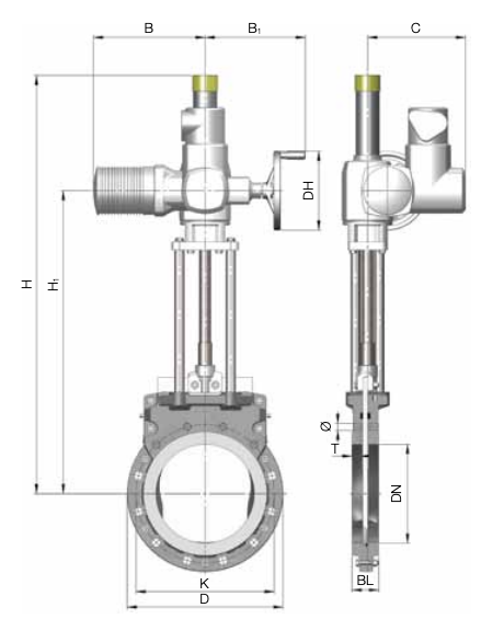| DN/YD | Artikelnummer | Ø (mm) | Antal bultar | B (mm) | B1 (mm) | BL (mm) | C (mm) | D (mm) | DH (mm) | H (mm) | H1 (mm) | K (mm) | Max bar | T (mm) | Vikt (kg) |