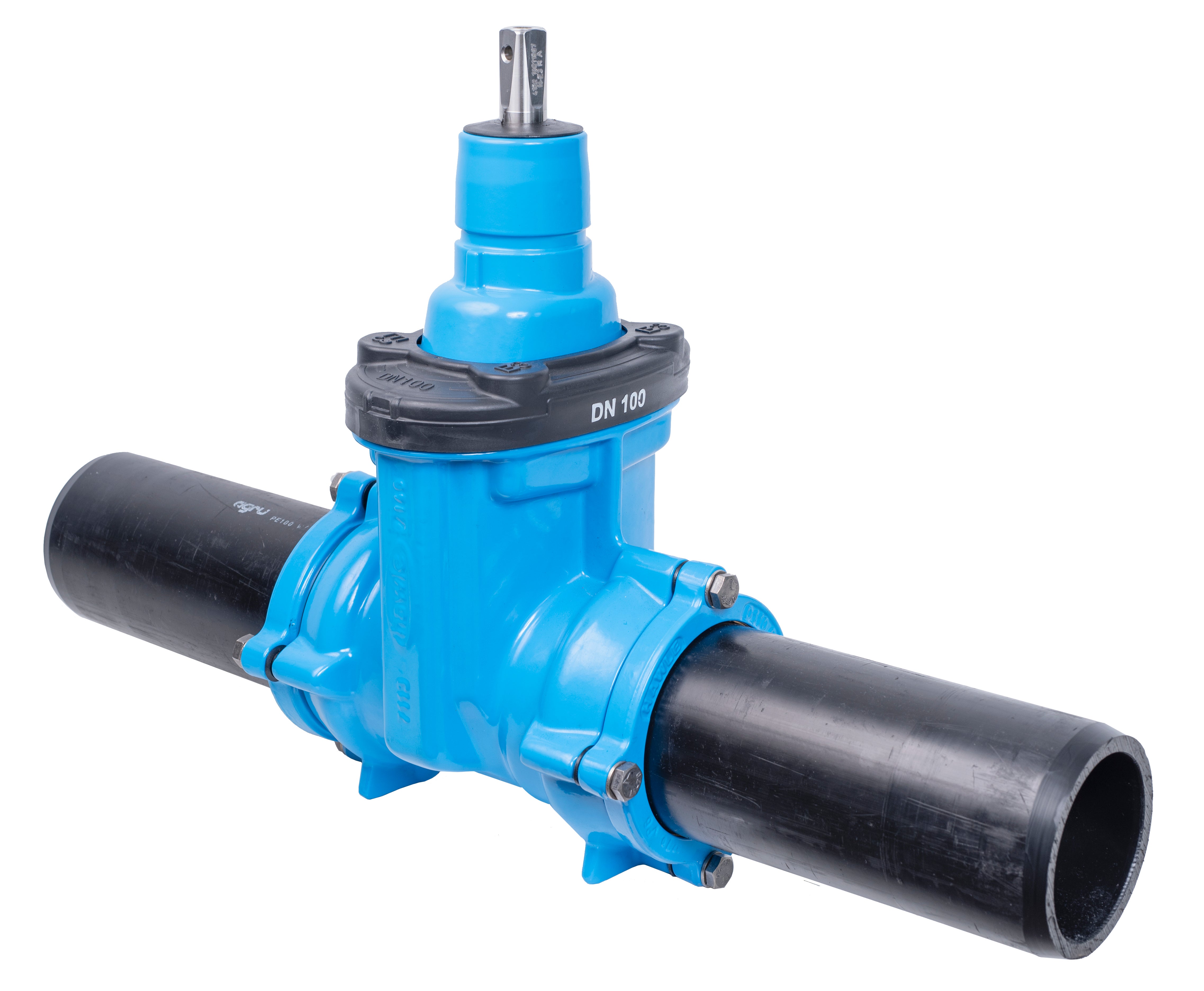 Mjuktätande slussventil med dragsäkra fabriksmonterade PE-ändar i SDR11. Utrustad med kullager i ventilhalsen (från DN 250) för låg manöverkraft även efter lång drift. Ventilhus i segjärn med epoxibeläggning ≥250 μm och skyddsring mot transportskador. Spindel i duplexstål och överdimensionerad kägelmutter för maximal hållfasthet.