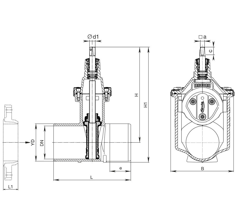 | DN/YD | PN | Artikelnummer | B (mm) | e (mm) | Spindel a (mm) | Spindel c (mm) | Spindel Ød1 (mm) | Ventil H (mm) | Ventil H1 (mm) | Ventil L (mm) | Vikt (kg) |