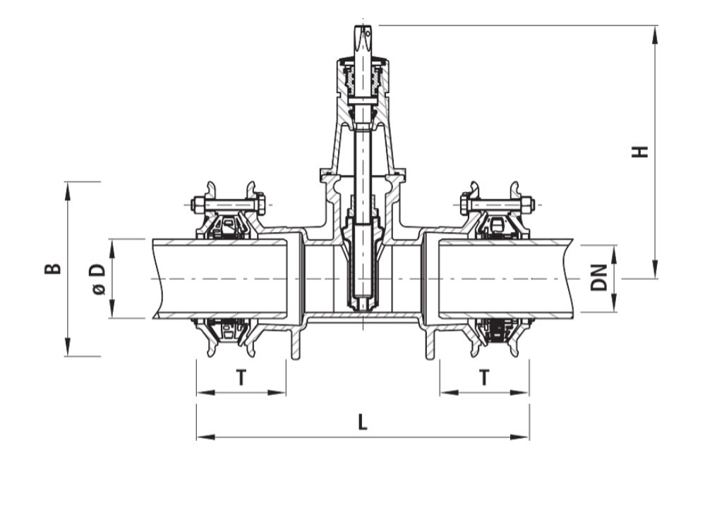 | DN / ØD | PN | Artikelnummer | B (mm) | T (mm) | Ventil H (mm) | Ventil L (mm) | Vikt (kg) |