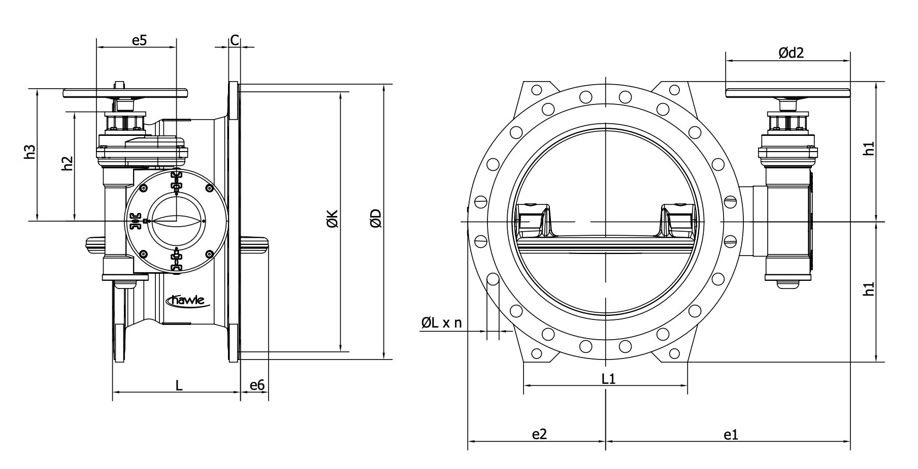 | DN/PN | PN | Artikelnummer | C (mm) | Ød (mm) | Ød2 (mm) | e1 (mm) | e2 (mm) | e5 (mm) | e6 (mm) | h1 (mm) | h2 (mm) | h3 (mm) | ØK (mm) | L Serie 14 | ØL x n (mm) | L1 (mm) | Varv öppna/stäng | Vikt (kg) |