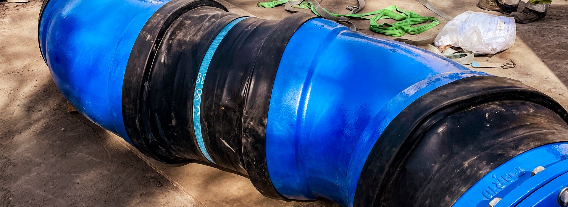 För att lyckas med detta komplexa montage användes ett brett urval av tryckrördelar från TRM, samtliga tillverkade i segjärn och utrustade med det dragsäkra VRS®-T låssystemet. Rördelarna är epoxybelagda enligt GSK och RAL GZ662, tillverkade enligt EN 545, och tydligt märkta för högsta spårbarhet och kvalitetssäkring. Gummipackningen av läppringstyp förenklade installationen i de trånga och böjda utrymmena, samtidigt som den säkerställde ett tätt och stabilt montage.